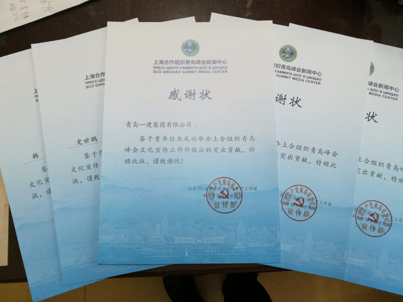 Recently, four employees of Qingdao No.1 Construction Group and the company were awarded a Certificate of Thanks from the Information Center of the Shanghai Cooperation Organization Qingdao Summit issued by the Propaganda Department of the Qingdao Municipal Committee of the Communist Party of China, which is the best affirmation of Qingdao No.1 Construction Group's contribution to the Summit.